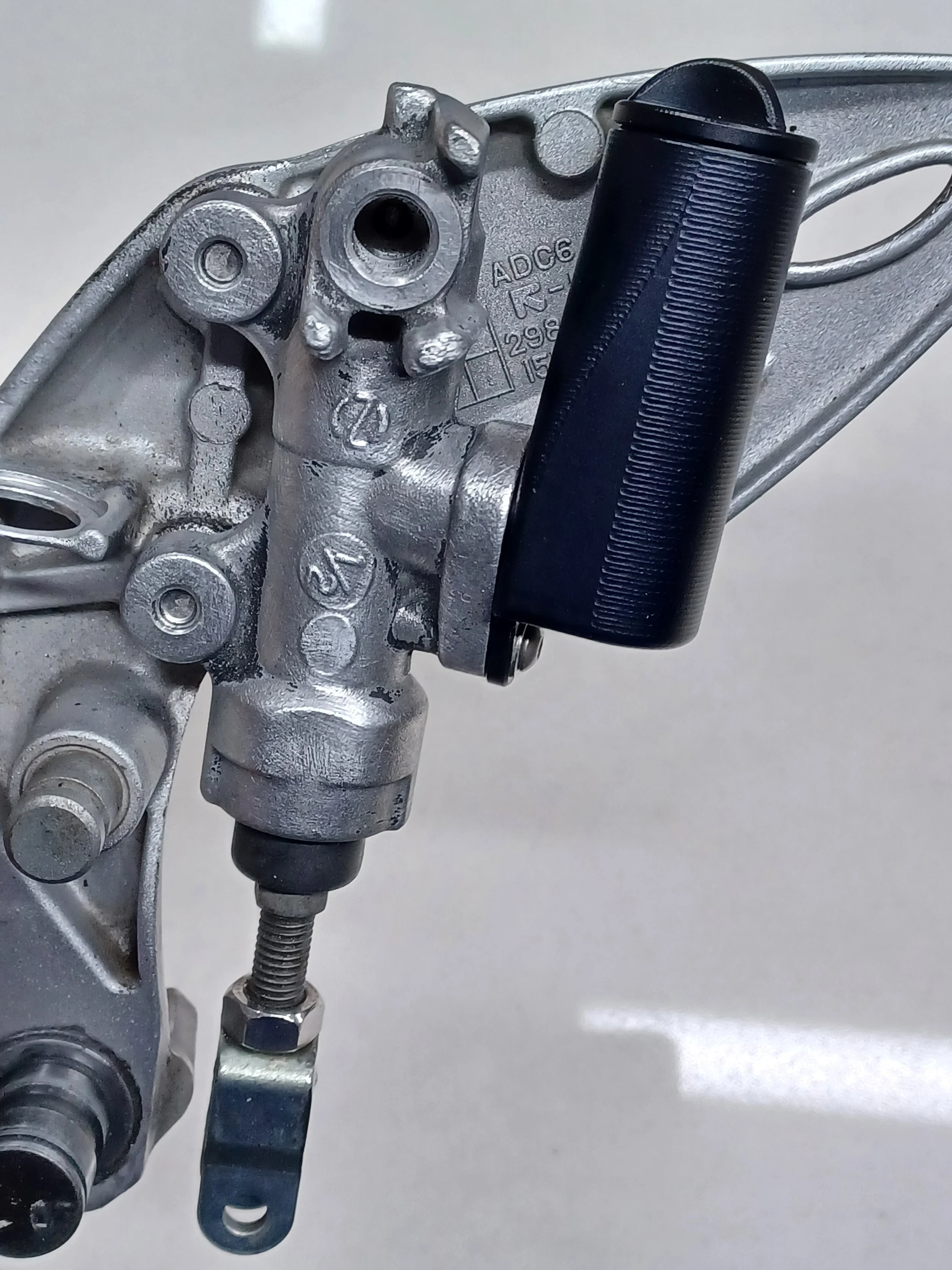 Billet rear brake fluid reservoir anodised black This replaces the rubber hose & plastic reservoir which is installed behind the rear panels making bleeding the rear brake a much simpler job and it looks better This also works on the GSXR1000 2003-2008, GSXR750 2004-2005 and the GSXR600 1997-2005